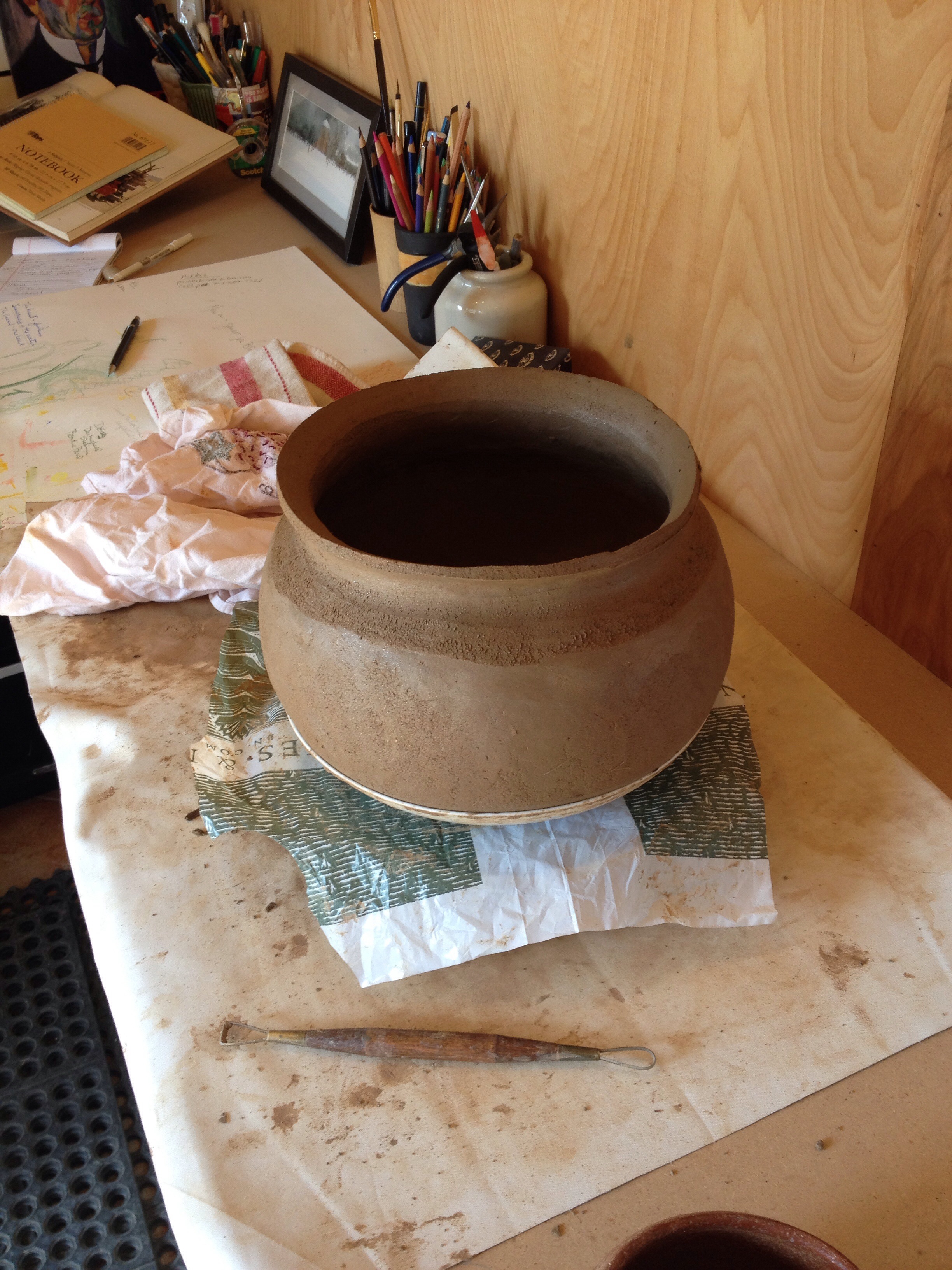 In progress — a 4-quart cooking vessel. Now it sits, to become hardened and then water scraped.